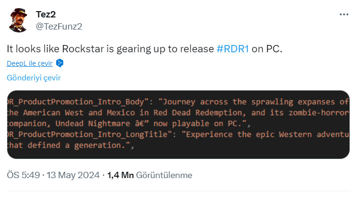 Aktif bir Rockstar topluluğu üyesi ve dataminer olan Tez2’nin yaptığı veri madenciliği çalışmasında ortaya çıkan bilgilere göre, Red Dead Redemption ve efsanevi eklenti paketi Undead Nightmare, PC platformuna geliyor. Rockstar’ın istemci sitesindeki dosyalarında yapılan güncellemelerle ortaya çıkan ekran görüntüleri, Red Dead Redemption’ın masaüstü oyuncuları için hazırlandığını gösteriyor.