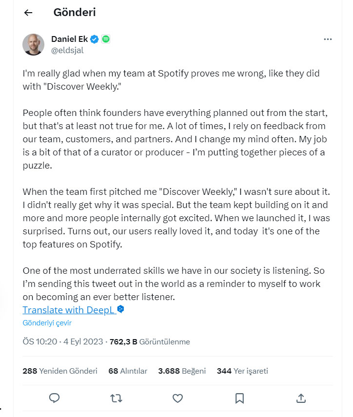 | Spotify ekibimin Haftalık Keşif özelliğinde yanıldığımı kanıtladığı için gerçekten mutluyum. İnsanlar çoğu zaman kurucuların her şeyi en baştan planladığını düşünürler. Ama bu durum; en azından benim için çok da doğru değil. Genelde ekibimizden, müşterilerimizden ve ortaklarımızdan gelen geri bildirimlere güvenirim. Ve sık sık fikir değiştiririm. Benim işim biraz küratörlük ya da yapımcılık işi. Bir yapbozun parçalarını bir araya getiriyorum. Ekibim bana ilk kez "Haftalık Keşif" özelliğini sunduğunda bundan emin değildim. Neden özel olduğunu gerçekten anlamamıştım. Ancak ekip bunu geliştirmeye devam etti ve giderek daha fazla insanı heyecanlandırdı. Başlattığımızda şaşırdım. Kullanıcılarımızın onu gerçekten sevdiği ortaya çıktı ve bugün Spotify'ın en iyi özelliklerinden biri haline geldi. Sahip olduğumuz en küçümsenen becerilerden biri dinlemektir. Bu paylaşımı dünyaya, daha iyi bir dinleyici olma yolunda çalışmam gerektiğini kendime hatırlatmak için gönderiyorum. |